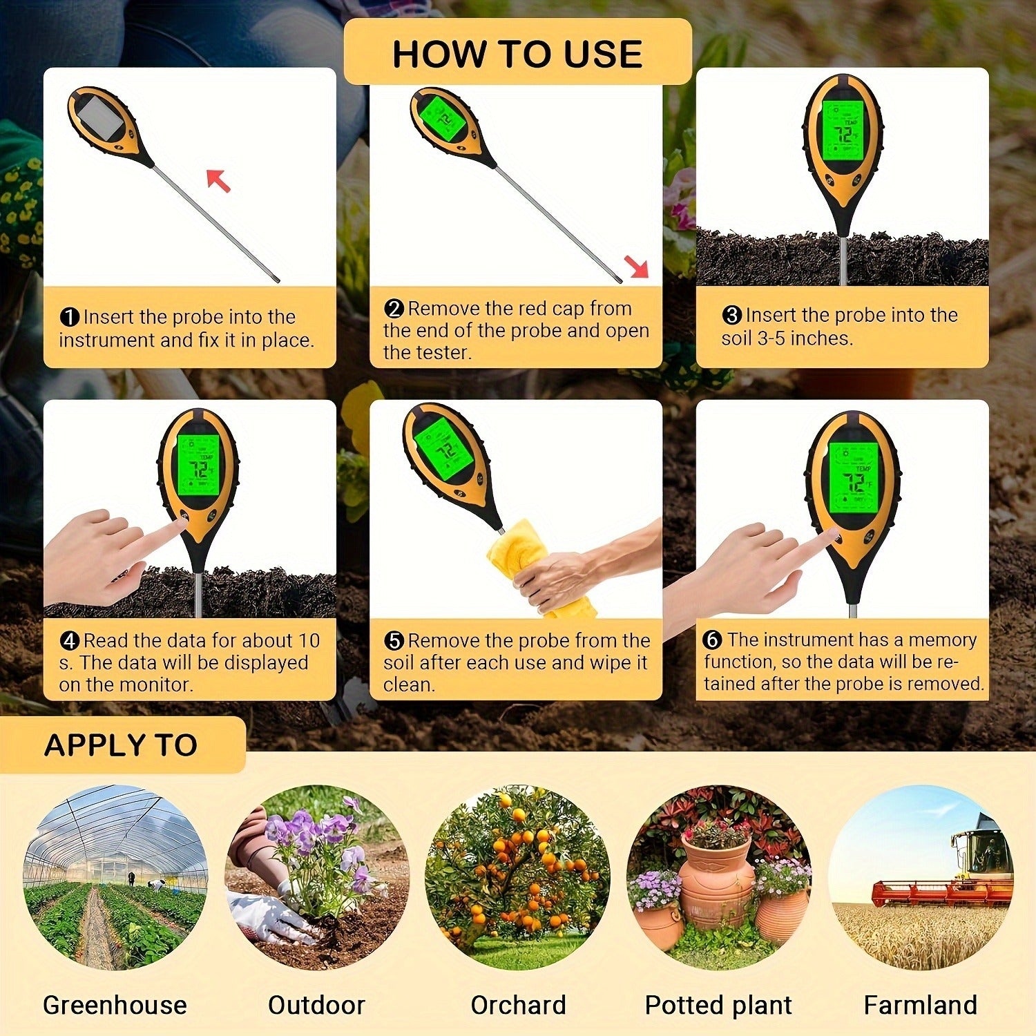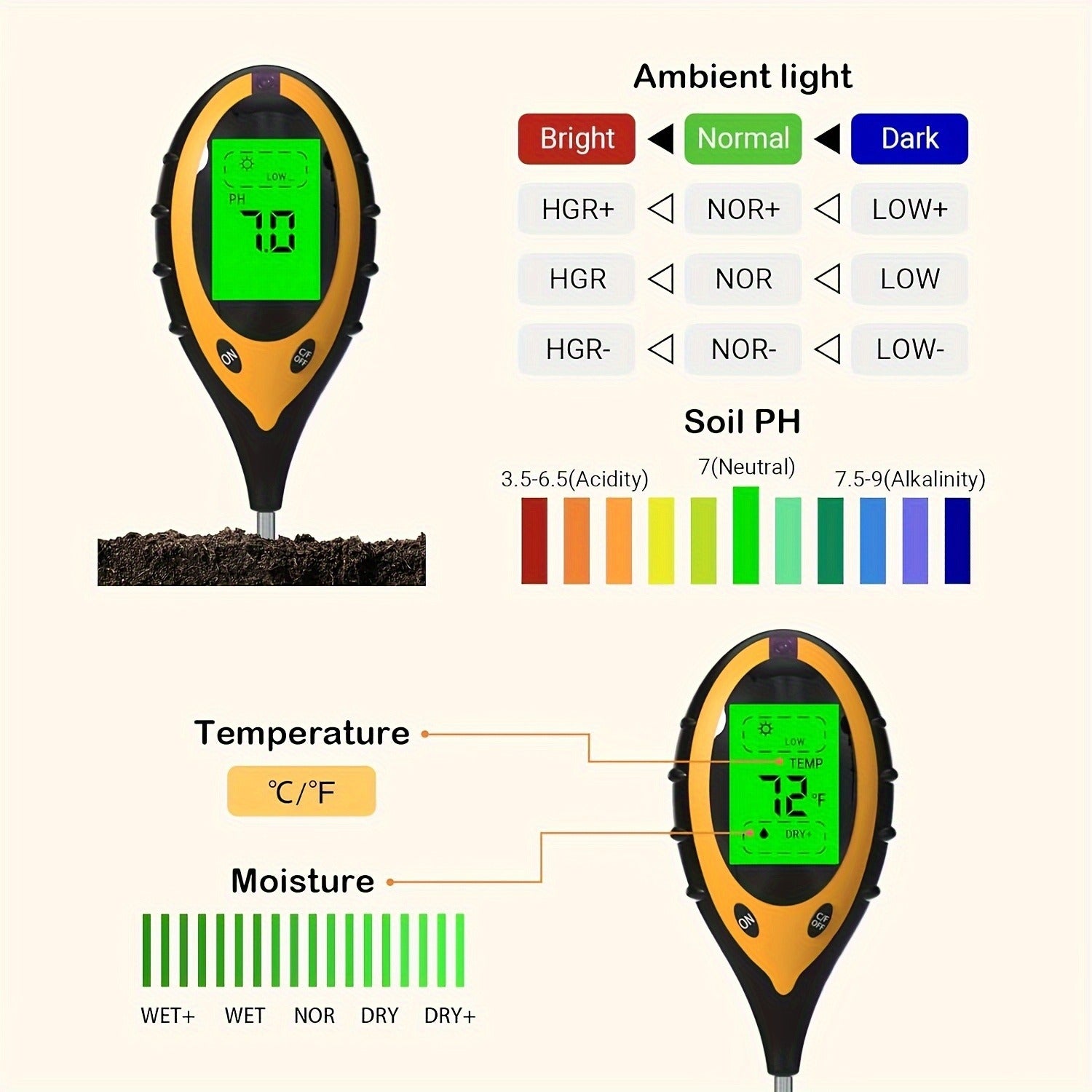 - 4 Functions in 1: Measures soil moisture, pH level, sunlight intensity, and temperature