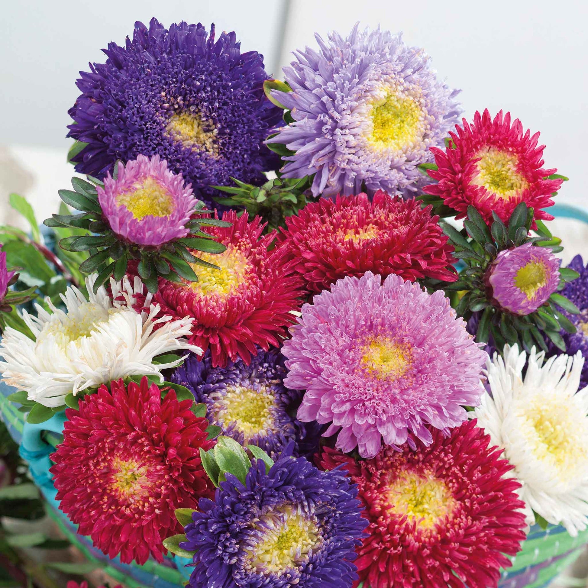 Aster chinensis Princess produces striking, fully double blooms shaped like small chrysanthemums. Their rounded heads are packed with petals, creating a lush, textured effect that stands out in winter gardens. These sturdy plants perform well in pots or borders, flowering through the cool season and lasting long when cut for arrangements. With sun and good soil, they reward you with steady color from late winter into spring.