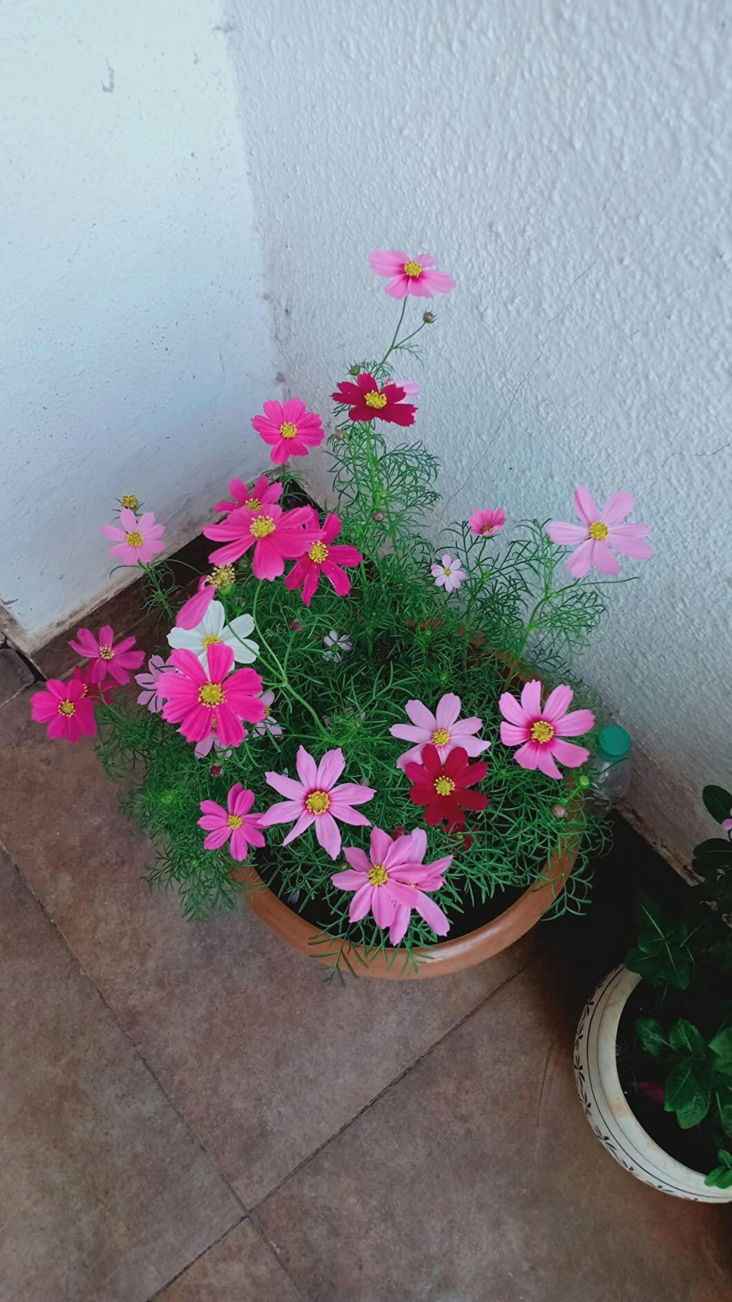 Cosmos Mixed produces bright, daisy-like blooms in pink, white, and purple that flower all season long. It thrives in warm weather, full sunlight, and grows well in 8-12 inch pots or garden beds. This easy-to-grow plant adds a cheerful touch with minimal care.