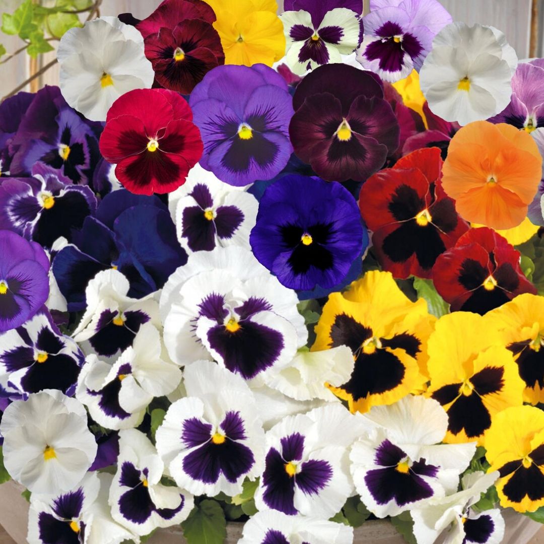 Pansy Giant Mixed produces large, velvety blooms in bright and pastel colors with distinct face-like markings. It thrives in cool weather, partial shade to full sunlight, and grows well in 8–10-inch pots, flower beds, or borders. This cold-tolerant plant is perfect for adding winter and spring color with easy care.