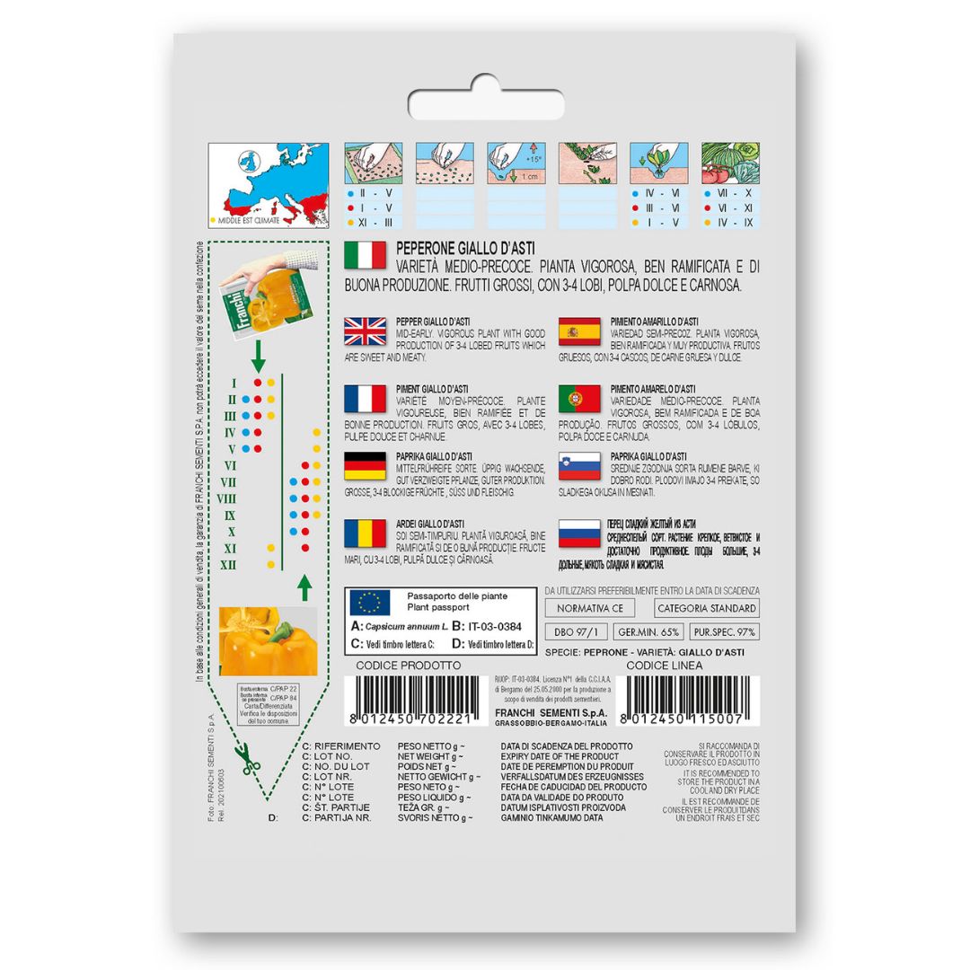 Peperone Giallo D’Asti produces large, blocky yellow bell peppers with thick, juicy walls and a naturally sweet flavour. The fruits develop a bright golden-yellow colour and a smooth, glossy skin, making them excellent for salads, grilling, roasting, and stuffing. This vigorous variety grows best in warm weather, full sunlight, and performs reliably in 12–14 inch pots or garden beds. A strong, heavy-yielding bell pepper for home gardeners.
