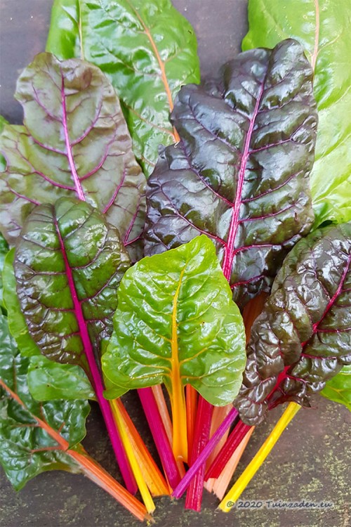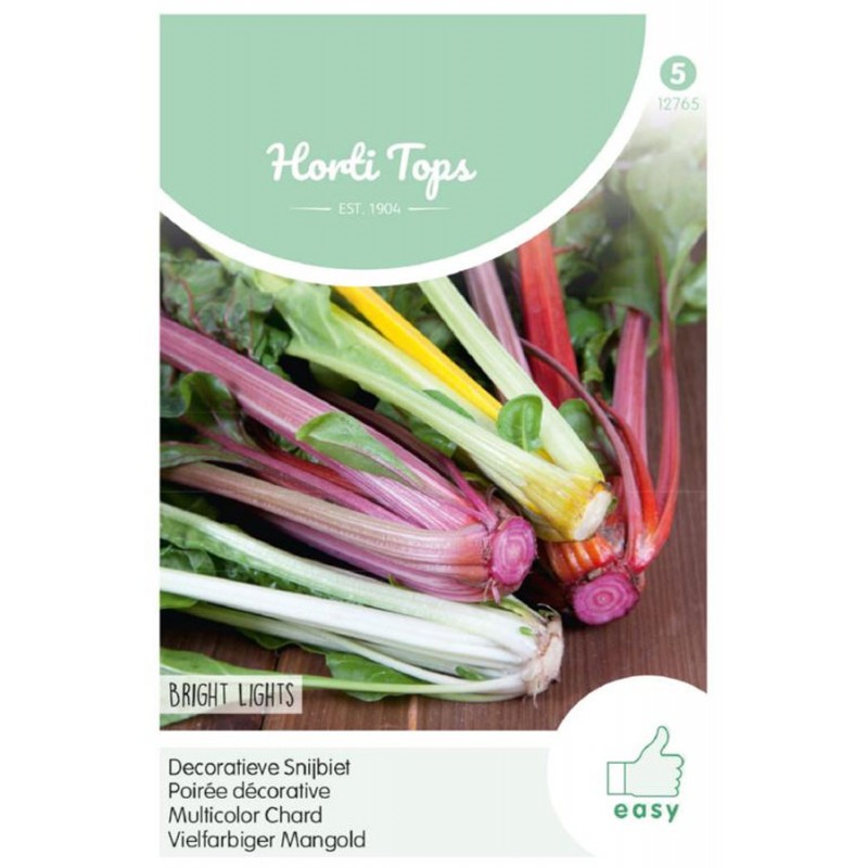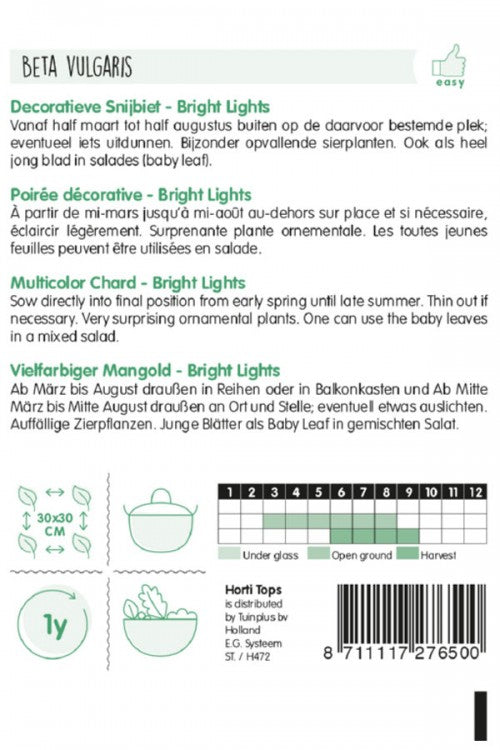 Swiss Chard Bright Lights, also known as Rainbow Chard or Leaf Beet, is a colorful leafy green grown for both its beauty and nutrition. The stems appear in striking shades of red, yellow, pink, and orange, while the broad green leaves are tender and delicious.